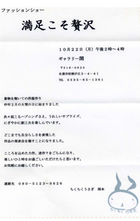 着物を解いての洋服作り 昨年2月の大雪の日に始まりました。 次々起こるハプニングさえ、うれしいサプライズ、 にぎやかに創工夫を楽しんでいます。 どこまでも自分らしさを表現した 作品の発表会を催すことになりました。 こころを込めた力作、迷作?をごらんになり、 楽しいひと時をお過ごしいただけたらと思います。 お気軽にお越しください。 ちくちくうさぎ 岡本 |