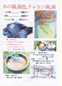 木の器・・・岡崎正巳 ,染色・・・廣瀬信子 クレヨン画・・・藤川みちこ 40年程前、田舎暮らしに憬れ、美杉に移り住まれた三人です。 無我夢中で過ごしてきた日々、楽しいことも苦しいことも、 美杉の自然と共にありました。 お互い刺激を受けたり、批評しあったり、 今も好きなことを続けていられるのも 仲間がいてくれるからだとおっしゃいます。 絵、木彫り、染物「 少し見せます展」として、 ご披露いただくことになりました。 どうぞ、力作の数々、お楽しみくださいませ。 |