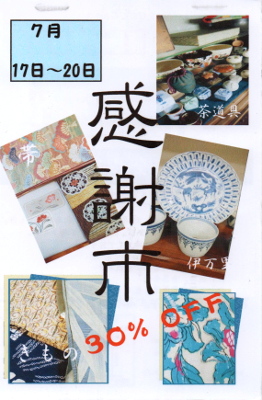 年に一度の感謝市、昨年は開催出来ませんでした。 今年は対策を万全に、開催させて頂きます。 ご来店お待ちしております。 ☆ 着物・帯 ☆ リメイク用着物、多数有り ☆ 道具、食器類全般 ☆ お稽古用茶道具色々、一部割引除外有 |